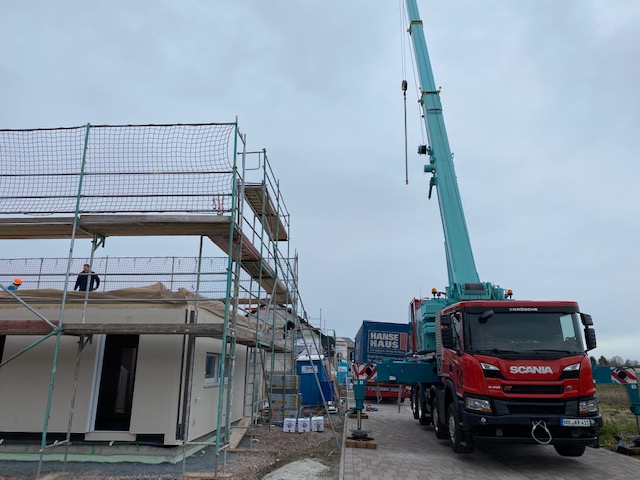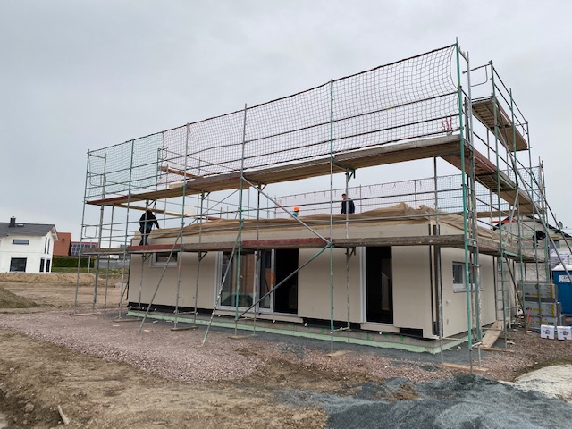 Trotz angekündigtem „Sturm“ haben wir heute den ersten Teil des Hauses meiner Bauherrenfamilie in Guntersblum montiert. ⚠️ Nach dem Verlegen der Decke, wurde das Erdgeschoss mit einer Plane abgedeckt. Morgen kommt dann noch der Kniestock und das Dach, bevor dann bereits am Mittwoch mit den Installationsarbeiten begonnen wird.